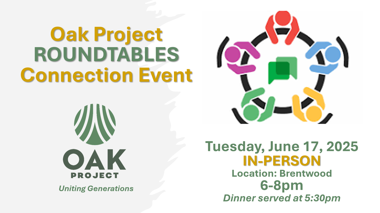 Research from the State of Nashville report shows that creating community in Nashvilleis not easy, at any age… especially if you are a newcomer. In response to thisphenomenon the Oak Project is creating opportunities to build community, both peerand intergenerationally.The Oak Project Roundtables are an in-person, intergenerational event for all 2025mentors and mentees. We will offer 4 Round-Robin… |